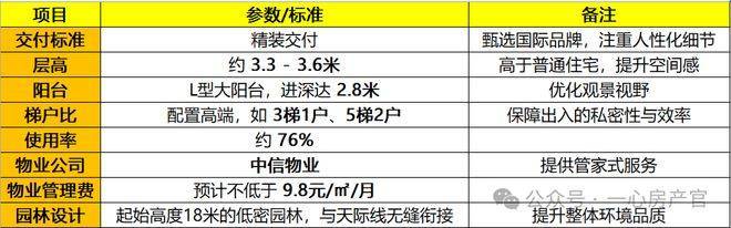 项目采用精装交付,层高在3.3米至3.6米之间。物业费预计不低于9.8元/㎡/月,由中信物业提供管家式服务,整体规划为涵盖住宅、商业、酒店、办公等业态的大型综合体,总建筑面积约31.64万平方米。小区采用空中花园设计,住宅起始高度约18米,以优化视野和私密性。