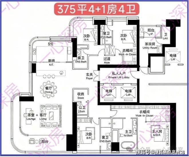1D栋(1栋四单元)-45层:均为3梯2户,约305㎡,一层两户。