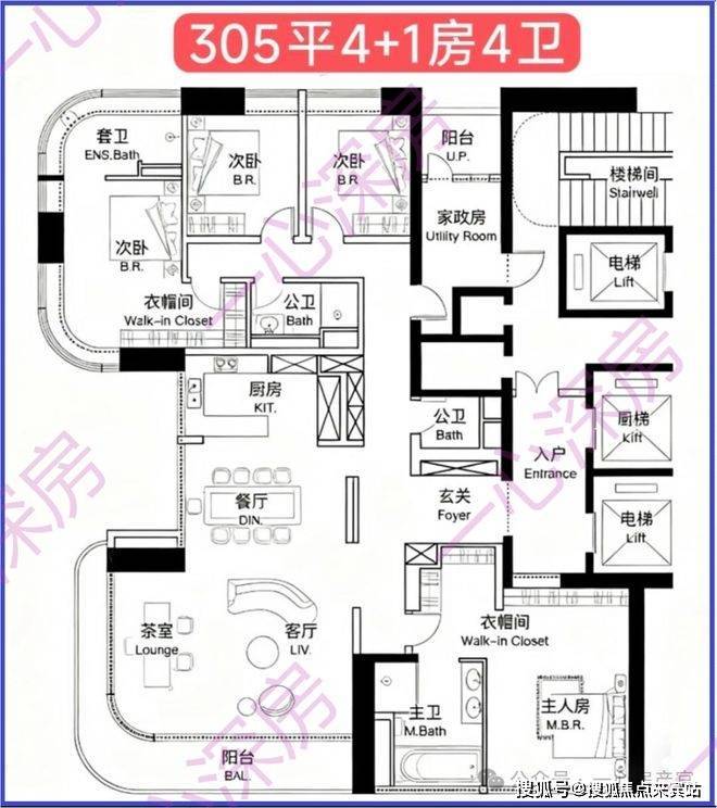 1E栋(1栋五单元)-43层:均为3梯2户,约305㎡,一层两户。