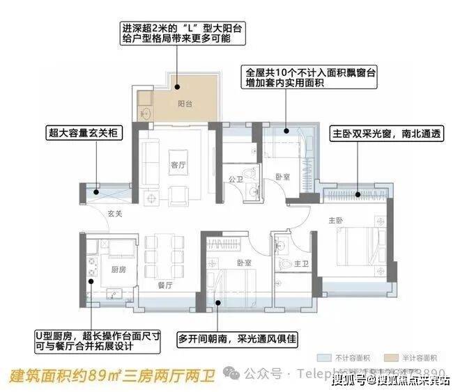 约89㎡三房两卫:南北通透,实用约91%,近10处飘窗,套房式主卧,U型厨房。