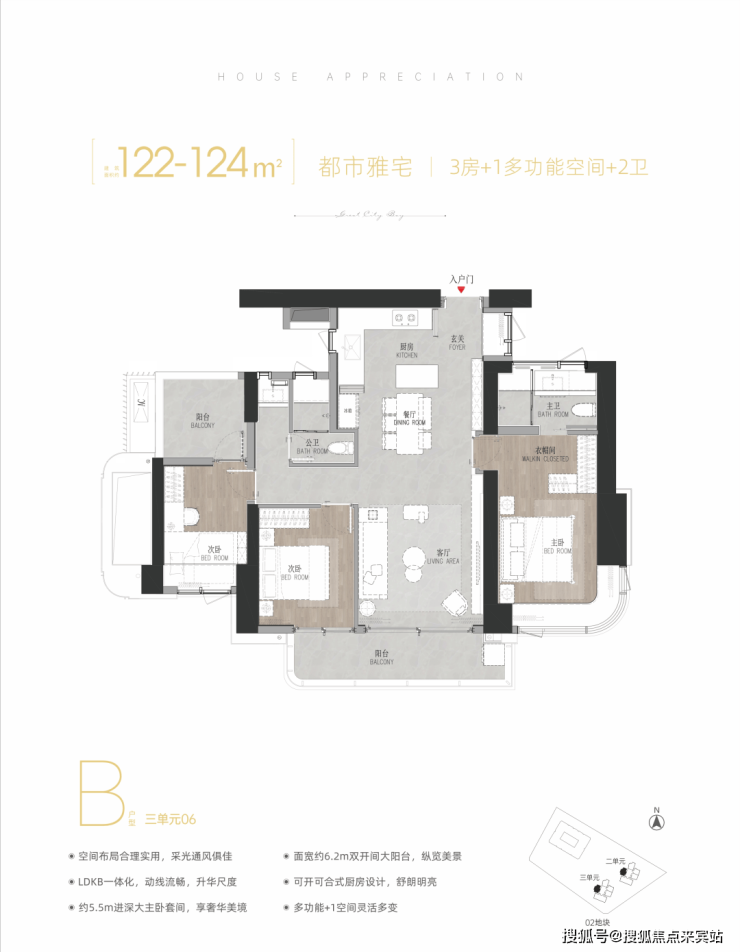 122-124㎡3+1房2厅2卫,有竖厅、横厅和双龙抱珠户型,跟之前03地块户型完全一致。