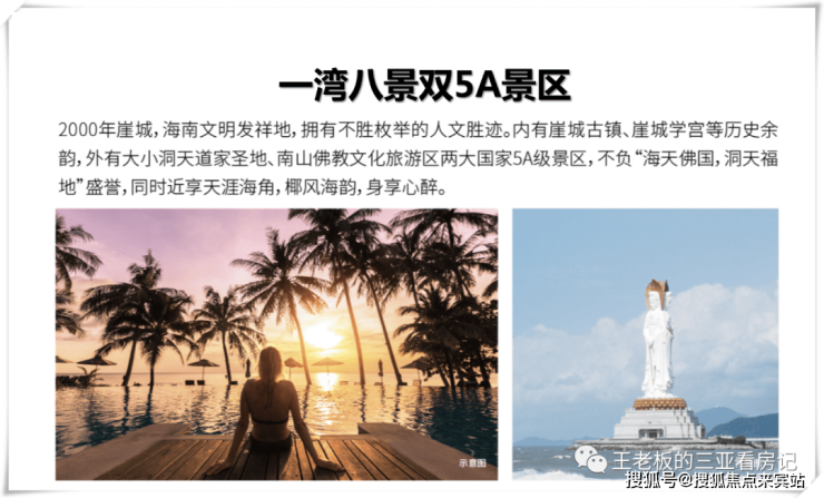 周边还有多个旅游景点:大小洞天(距项目6公里)和南山寺(距项目8公里),崖州古城、南天门生态大观园、兰花主题公园等。崖城还是海南首个历史文化名镇,保留了诸多的历史古迹,如迎旺塔、古城墙、孔子书院等,同时崖城老城区是华夏有名的长寿之乡,这里现有已统计的百岁老人有100多位。