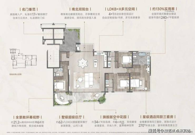 62㎡墅质横厅+34㎡空中岛院:自由组合社交、家庭场景。