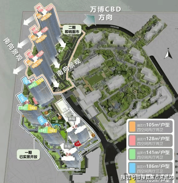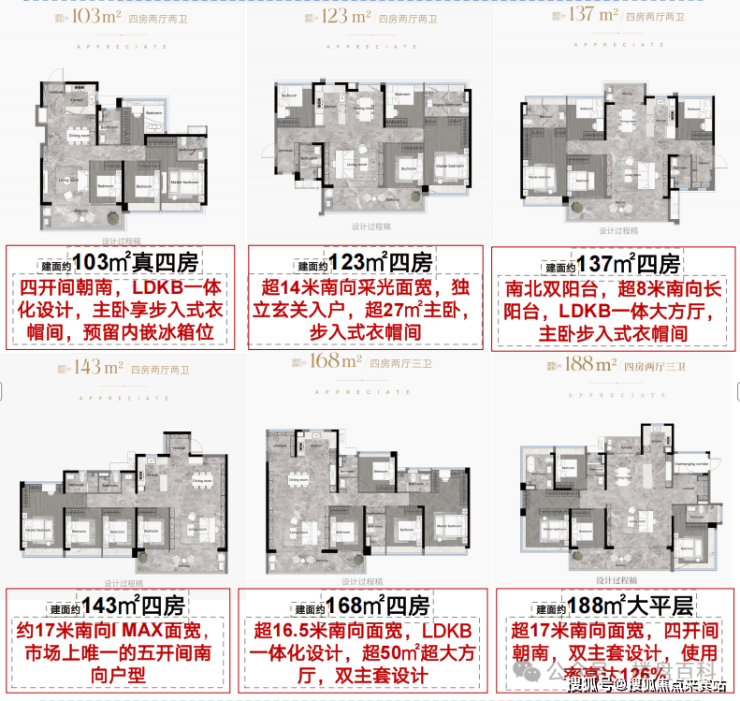 (1) 建面约188平四房,超17米南向面宽,四开间朝南,双主套设计,使用率高达126%;