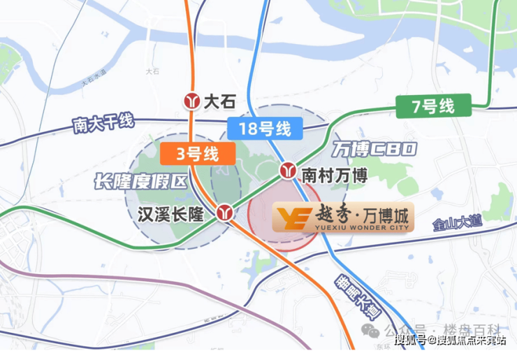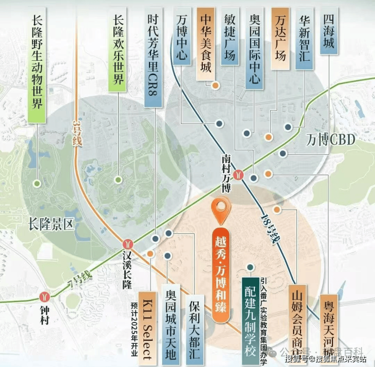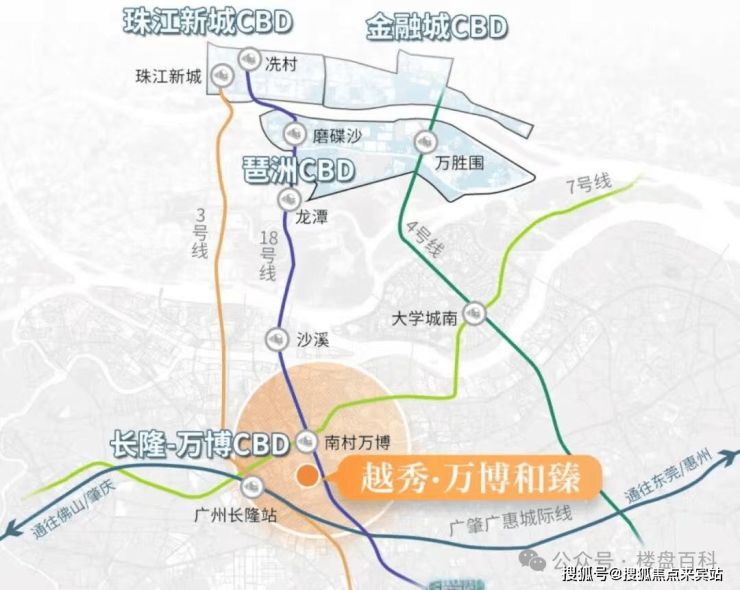 位于广州市番禺区鹤地塘边街3号,广州地铁7号线与地铁18号线交汇的南村万博站、以及与地铁3号线交汇的汉溪长隆站附近;坐落于番禺核心地段万博商圈,广州五大商圈之一,承接了广州未来10年的发展,前景无限!