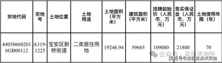 宝安新桥A319-1225宗地,位于宝安新桥中心路与瑞宁路交汇处北侧,总用地面积19246.94㎡,规定建筑面积59665.0㎡,用地性质为“二类居住用地,起始价为10.9亿元