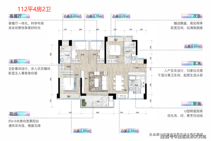 采光通风优越:通常为南向或南北通透户型,客厅直连约4.6米阔景阳台,主卧带南向飘窗,采光充足,通风良好,能保证室内空气流通和明亮度。