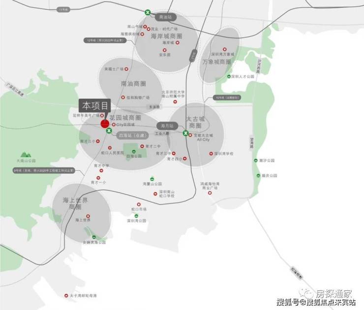 交通地铁: 项目临近在建的12号线四海站,临近南海大道;9号线南海大道支线、12号线、15号线四海站。半小时通达深圳机场、前海综合交通枢纽、太子湾邮轮母港以及深圳湾口岸。