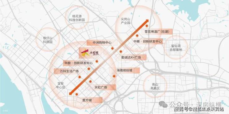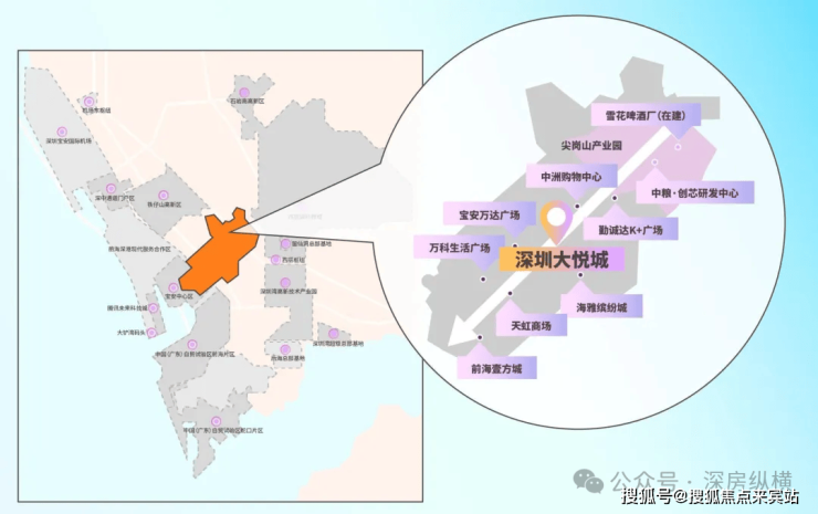 商圈汇聚:大悦城(在建)、壹方城、海雅缤纷城、中洲πmall、万达广场等。