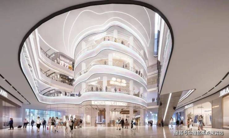 再者,在场景呈现上,秉承深圳科技之城基因,结合炫彩长虹玻璃、定制艺术灯光、吊顶数字装置等,在主入口内打造极具造型特色的室内中庭「悬浮山丘」,给消费者塑造出独特的立体漫游体验,也为进驻品牌的商业场景演绎创造了更多可能。