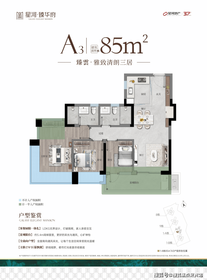 以 85㎡的户型为例,做到了三居,采用 LDKG 无界设计,客餐阳一体化,约 5.4m 阔景阳台,采光和通风都很好,而且是全南向户型,主卧还有 270° 巨幕飘窗,视野非常不错。