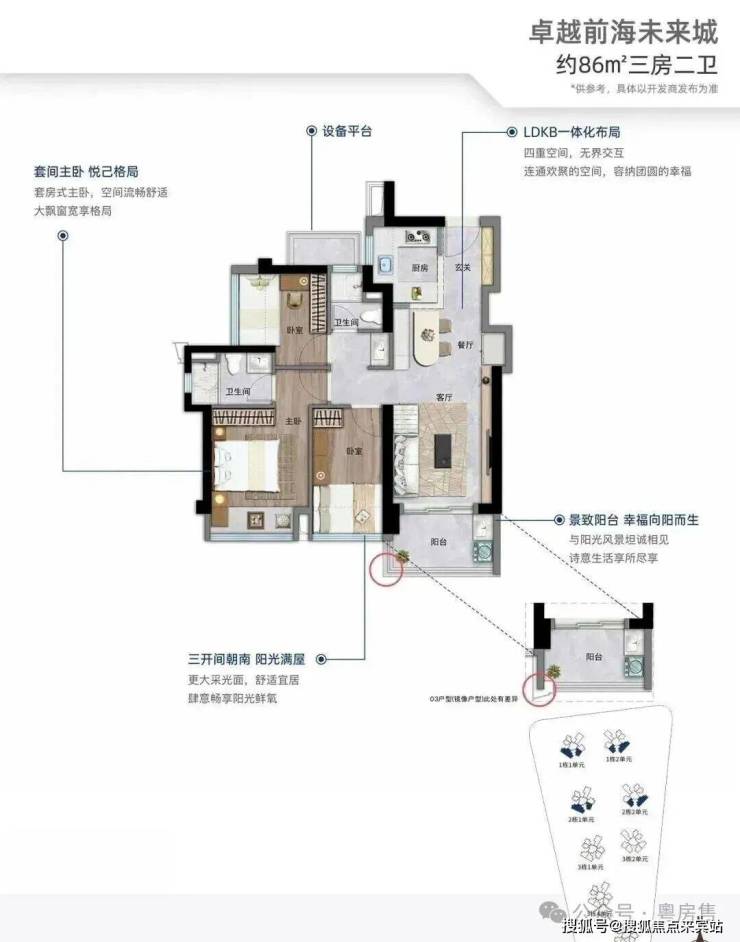 86㎡的3房2厅2卫,设计的是竖厅格局, 进门入户玄关,客厅3.2米开间,LDKB一体化,S墙设计预留冰箱位,三开间朝南,3个卧室分别做到了3米/2.4米/2.4米的宽度,U型厨房,公卫三段式分离,还带1个设备平台可以使用,得房率约:89%(包含赠送),阳台有东南或西南朝向