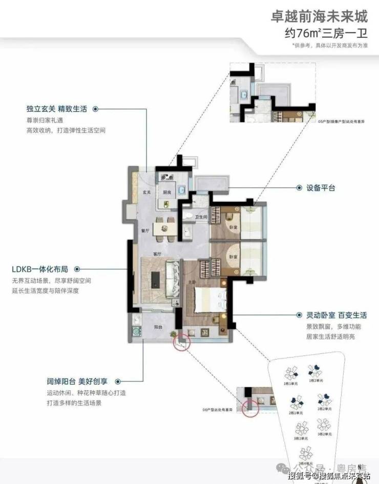 76㎡的3房2厅1卫,设计的是竖厅格局,进门入户玄关,客厅3.05米开间,LDKB一体化,S墙设计预留冰箱位,3个卧室分别做到了2.95米/2.3米/2.15米的宽度,U型厨房,卫生间三段式分离,还带1个设备平台可以使用,得房率约:89%(包含赠送),阳台有朝东北、东南或西南向