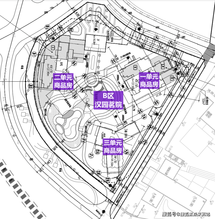 B区由3栋三个单元、裙房组成,其中一二单元层数45层,三单元层数39层,总户数474套;