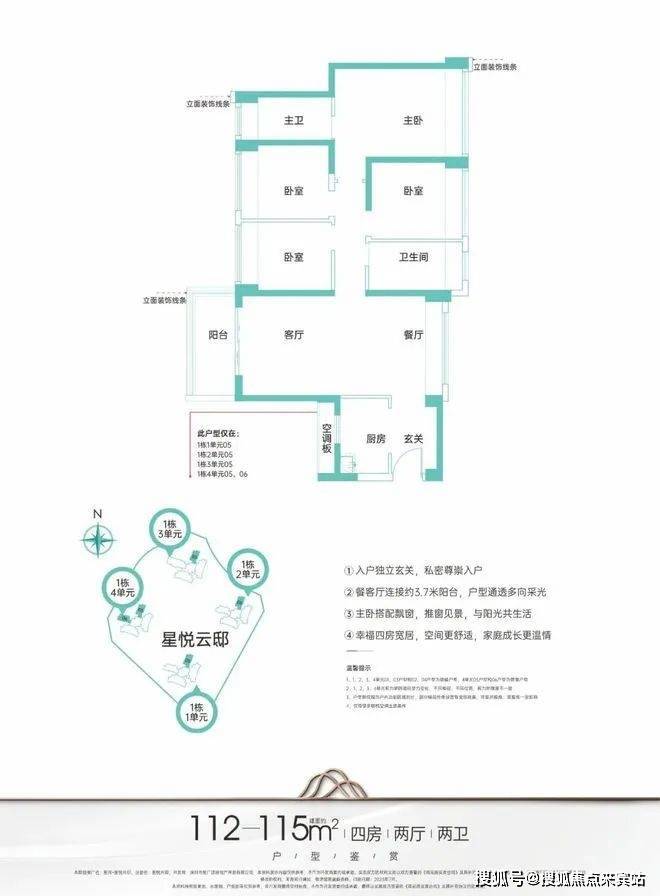 112-115㎡四房两厅两卫:竖厅通透格局,客厅3.7米开间,进门独立入户玄关,全屋飘窗设计。