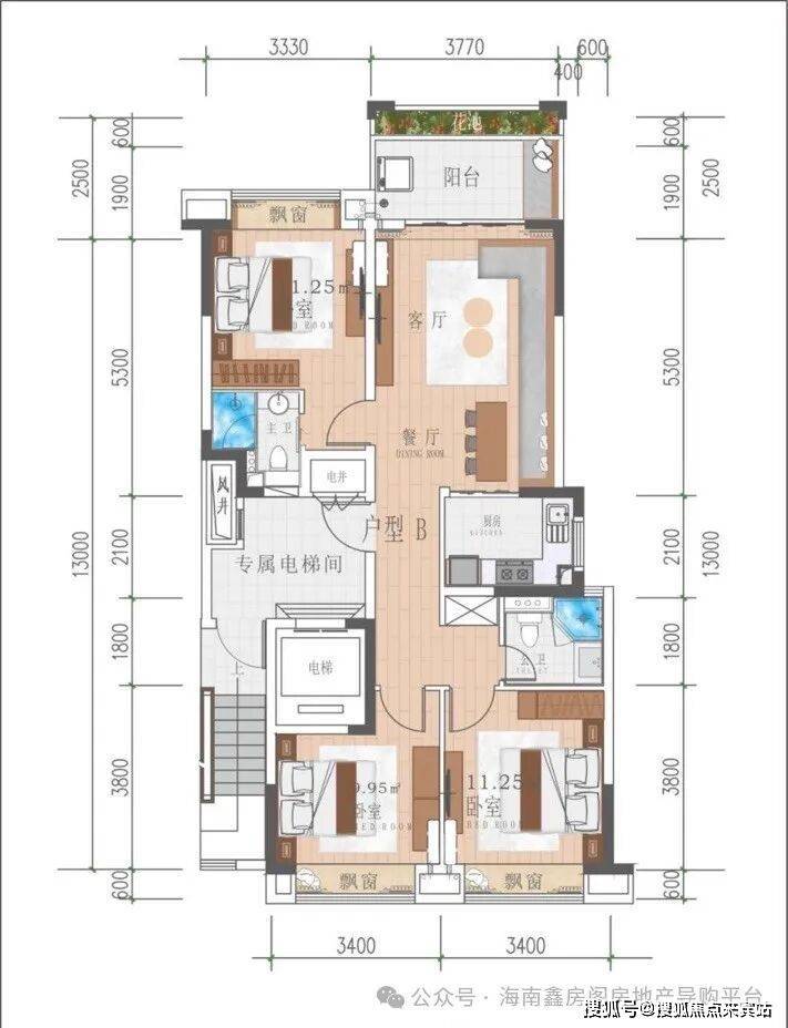 B户型:106.68㎡ 3房2厅1厨2卫