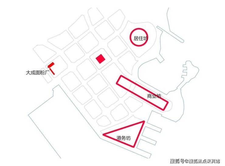 地块周围环境复杂,东侧与南侧是成熟的滨水休闲主题街区、大型购物中心,以及强IP的酒吧餐饮商业,并布有地铁2号线及12号线站点,北侧是市区人流主要抵达方向,现有的商业街区未能与西南侧的滨海休闲空间以及北侧的城市绿化轴有机连接。如何在纷繁的片区中以独特的场地属性脱颖而出,连接片区商业,引入往来的人流,构建大成面粉厂这一文化商业新锚点,是设计的关键。