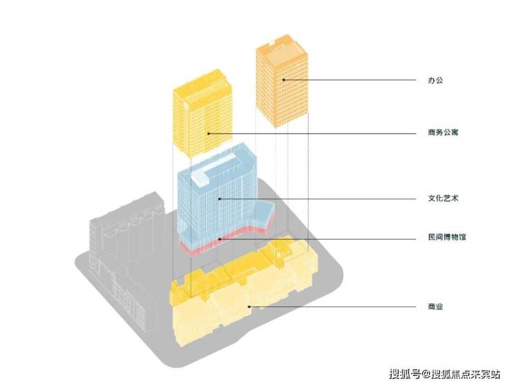 设计将文化艺术功能与博物馆垂直设置于椼架结构的独栋建筑之中,与筒仓比邻沿街设置,在确保建筑面积的同时,营造出架空的休闲及公共城市空间,一同构建起城市的文化界面;南侧以临街的商业裙楼连接内侧的公寓塔楼以及办公塔楼,形成极具活力的商业办公界面。新建筑与保留建筑自然融合,体量的围合退让结合东侧完全打开的公共界面,在地块中央形成了与城市空间相连的T字形公共区域。