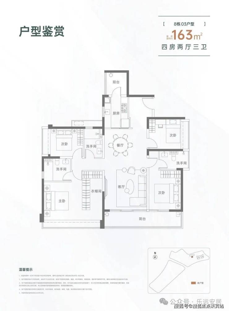 163㎡的4房2厅3卫,设计的是竖厅格局,一梯一户,进门入户玄关,LDKB一体化设计,三开间朝南,双主卧套房,客厅连接次卧出大阳台,L型厨房还带1个生活阳台,卫生间干湿分离,得房率约82%(不含赠送),东南朝向。