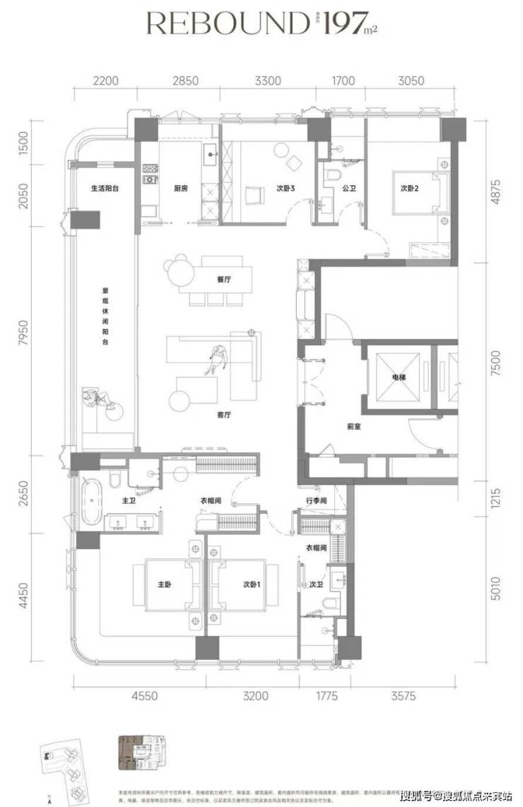 建面约197㎡户型为4房2厅3卫的正四房设计,全屋通透明厨明卫,豪气阔绰的客餐厅超大通厅,带来云端墅居的空间感。