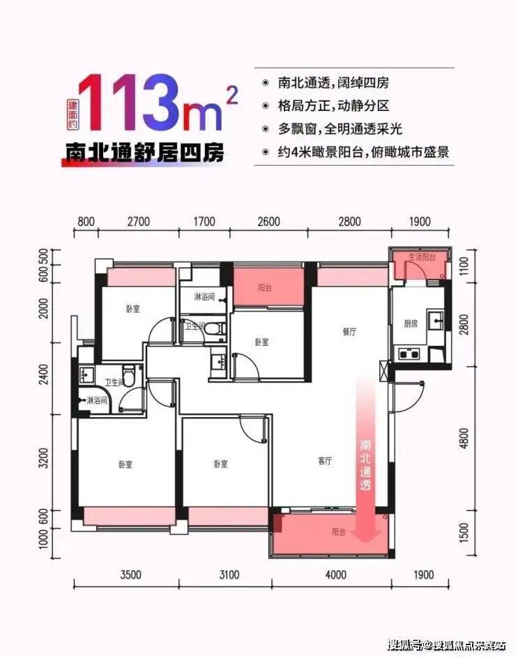 3、户型:建筑面积约113㎡四房两厅两卫,稀缺南北通透,三阳台设计,约4米阔景大阳台