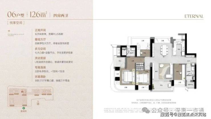 126m²的4房2厅2卫,设计的是竖厅南北通透格局,客厅3.9米开间,客餐厅分离化设计,五开间朝南,主卧套房270°环幕凸窗+私享阳台,七大凸窗+设备平台,分别做到了主卧20.23㎡/次卧9.92㎡/次卧9.3㎡/次卧8.77㎡(实测面积,去掉墙体),U型厨房,卫生间干湿分离,得房率超90%(包含赠送),正南朝向,看皇岗公园。