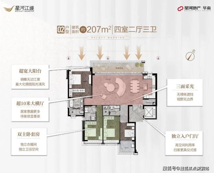 星河江缦全盘仅有342套单位,有且仅有四房起大平层,全部是双主套设计,追求的是私密尊贵。