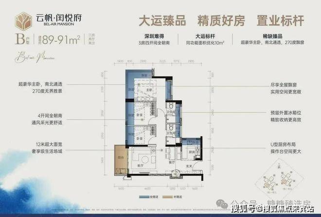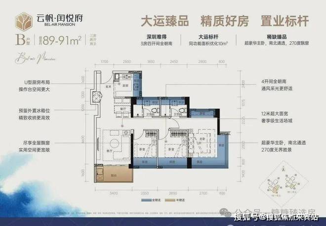 89㎡3房2厅2卫:设计的是经典竖厅格局:,进门入户玄关,客厅3.4米开间,U型厨房,四开间朝南,主卧南北通透270度景观,卫生间干湿分离。