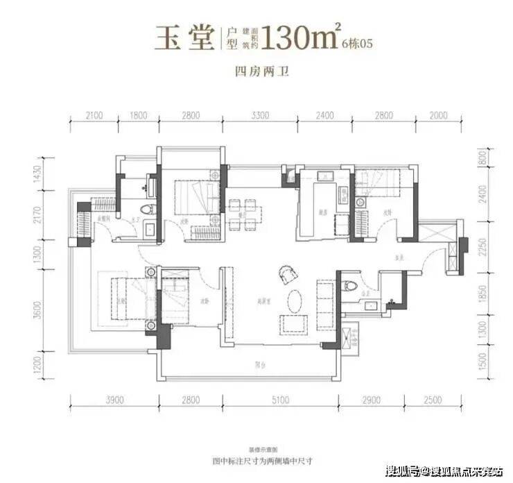 130㎡的4房2厅2卫,设计:南北通透,独立玄关,客厅5.1米宽。客餐厅分离,主卧270°飘窗+衣帽间,面积分别为23.66㎡、11.2㎡、8.96㎡、7.84㎡(含墙体飘窗)。U型厨房外置烟道,卫生间干湿分区,得房率101.95%(含赠送)。客厅连次卧大阳台14.09平,东北向。