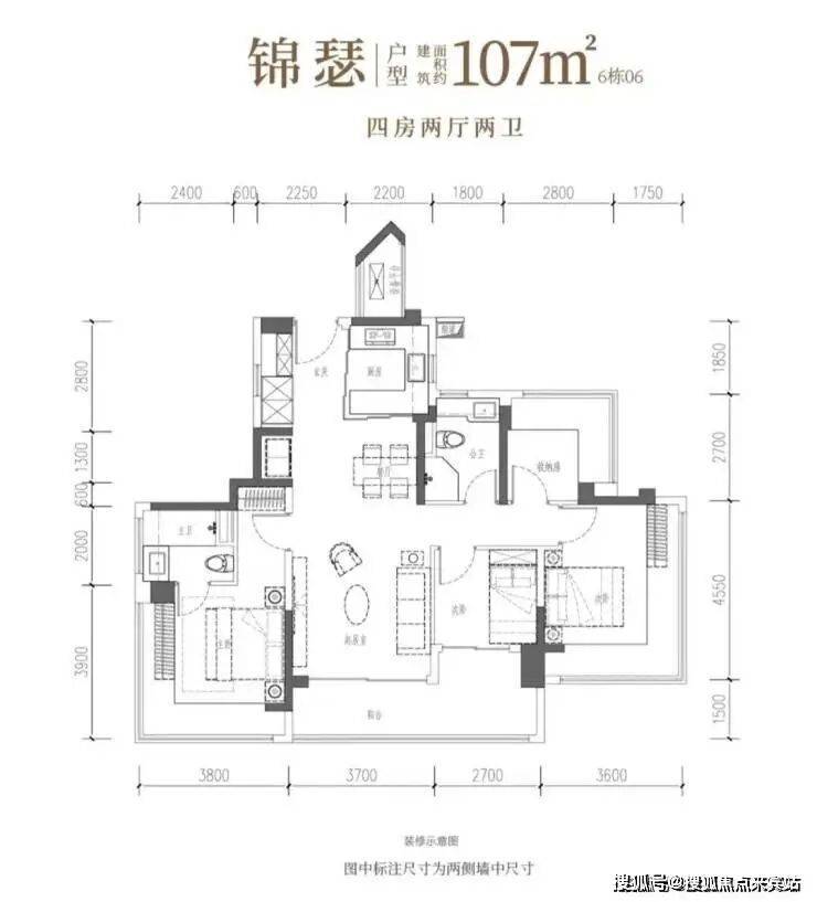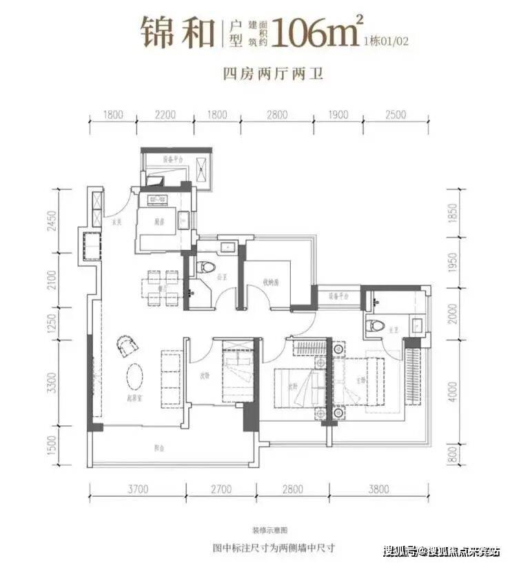 106㎡的4房2厅2卫,竖厅设计,客厅3.7米宽,LDKB一体,南向四开间,动静分区。主卧270°飘窗带1.52㎡平台,面积分别为20.34㎡、11.2㎡、7.7㎡和6.75㎡(含墙体飘窗)。U型厨房外置烟道,卫生间干湿分离,得房率101.16%(含赠送)。客厅连次卧大阳台11.76㎡,东南向。
