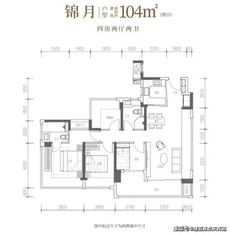 104㎡的4房2厅2卫,竖厅设计,客厅4.15米宽,LDKB布局,预留冰箱位,四房朝南。主卧270°转角窗带1.52平平台,面积分别为20.34㎡、11.2㎡、7.7㎡、6.75㎡(含墙体飘窗)。U型厨房外置烟道,卫生间干湿分区,得房率100.71%(含赠送),客厅连次卧大阳台11.23平,西南向。