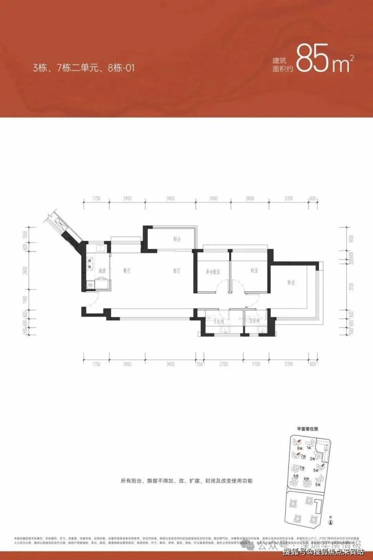 ①户型分析:小面积、低总价,最佳上车首选户型;全南向排布户型,多飘窗的设计,采光通风不错;户型方正,动静分区的设计注重隐私性;明厨明卫,三分离洗手间设计;②朝向:西南、东南向③视野:小区外围,临万丰路,看城市风景,施工建设区域【约85㎡三房两卫】户型分布:分布在7栋2单元、8栋、3栋,共710套,①户型分析:有横厅和竖厅两种户型,全屋7个飘窗、13米采光面,非常通透;预留超多收纳空间主卧双面采光,景观视野更开阔②朝向:东北、西北朝向③视野:社区花园和社区楼栋