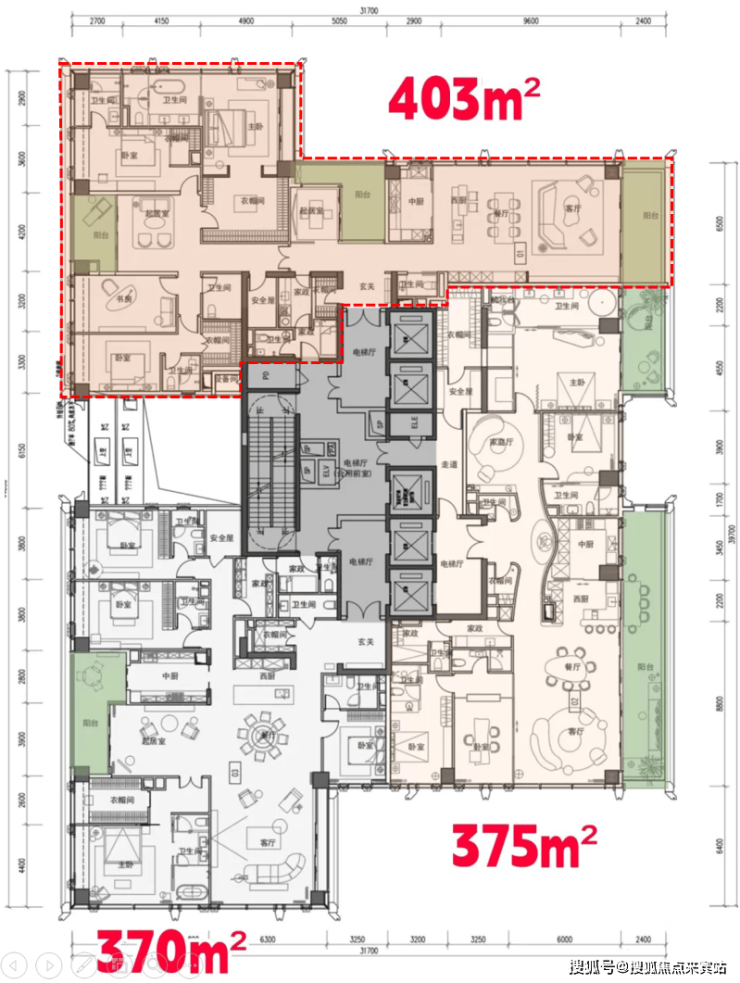而最大户型1050平,从现在的平面布置来看略显小气。主要原因是核心筒的长度过大,导致两边的空间被分割的过于琐碎。