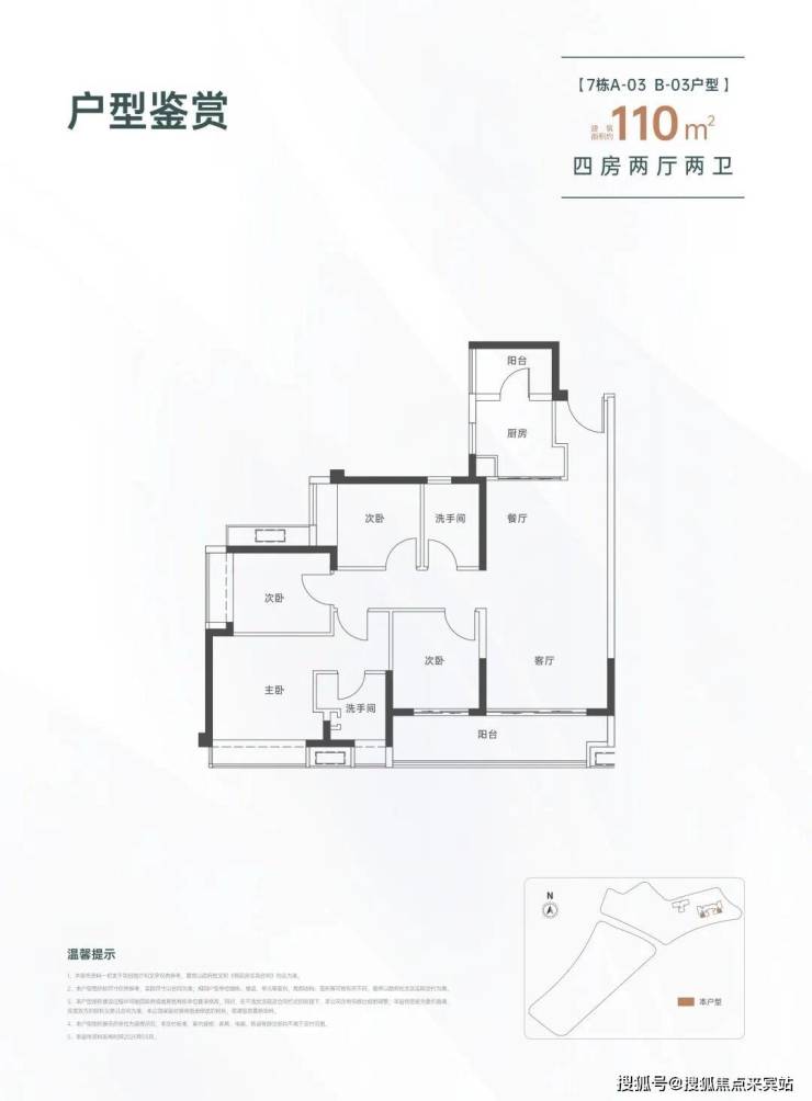 110㎡的4房2厅2卫,设计的是经典竖厅格局,进门入户玄关,LDKB一体化设计,四开间朝南,动静分区,客厅连接次卧出大阳台,L型厨房还带1个生活阳台,卫生间干湿分离,得房率约82%(不含赠送),东南朝向。