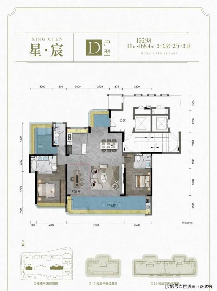 D户型: 建面约166.98-168.4㎡ 3+1房2厅3卫