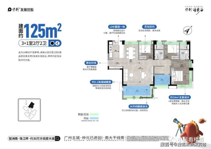 建面125平四房两卫,改善四房,18方豪华主套,L型全景飘窗,12米南向采光,总价300-310万左右。
