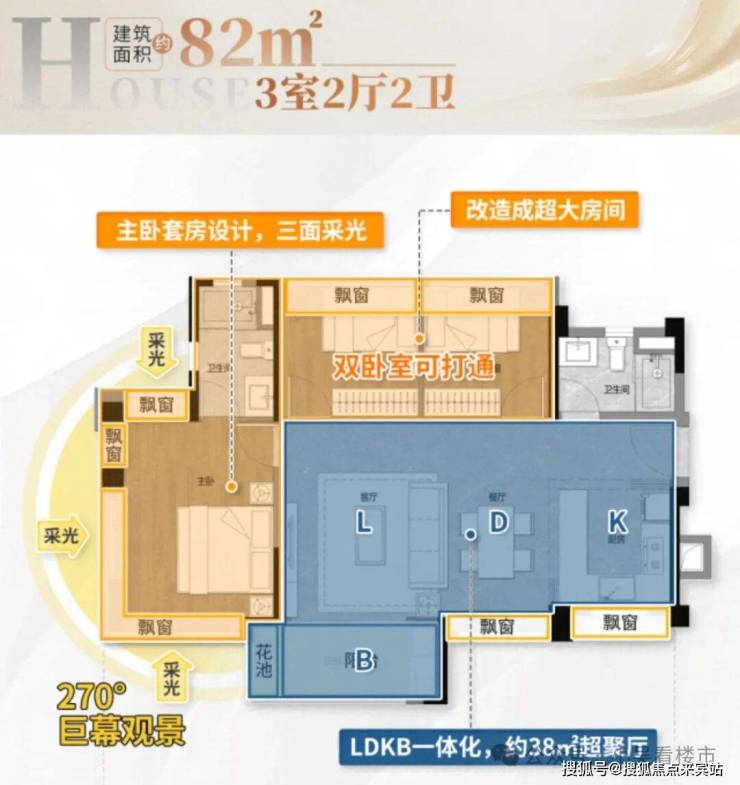 建面82平,南北对流户型,LDKB一体化设计,约14.5米采光面,客厅开间5.7米,总价160-170万左右。