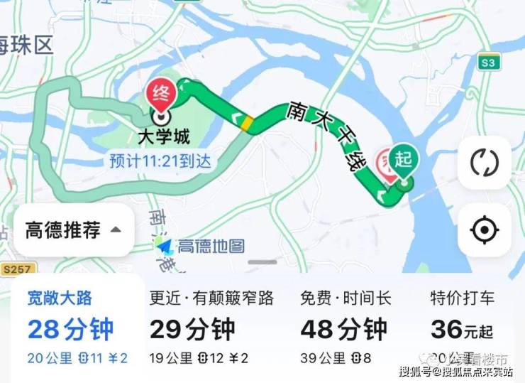自驾去往大学城:从项目出来上南大干线再转新化快速,去到大学城只需要20公里,全程耗时28分钟,高速费2元。