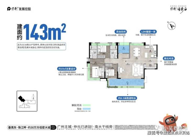 建面143平四房两卫,南北对流,约8.5米长阳台,西南西望园林,北向看海,主卧270度全景飘窗,总价370-400万左右。