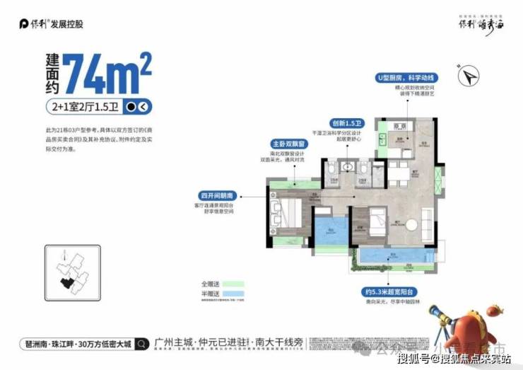 建面74平三房1.5卫,主卧双飘窗,南北对流,U型厨房,5.3米景观阳台,总价150-170万左右。