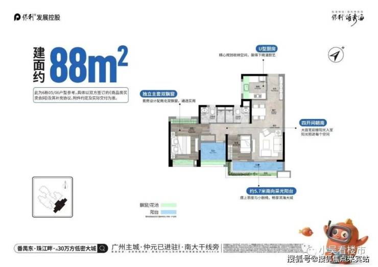 建面88平三房两卫,阳台连通次卧,5.7米南向景观阳台,东南向可看海,总价200-220万左右。