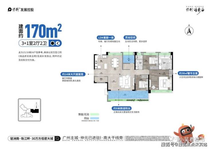 建面170平四房两卫,9米跑道大阳台,南北对流,正南向看园林,北看海,舒适度与私密性都很好,总价450-480万左右。