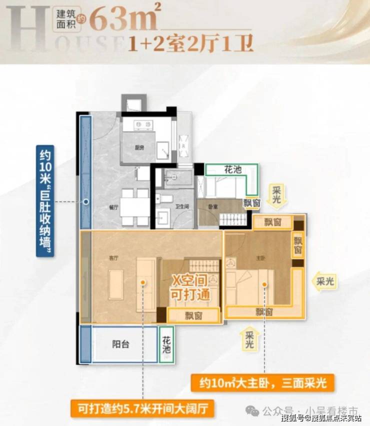 建面63平,传统竖厅户型,约10米的收纳墙,厅出阳台,靠近客厅的次卧可打通做成大方厅,三个270度观景台,使用率超过100%,主卧面积超10平,总价110-125万左右。