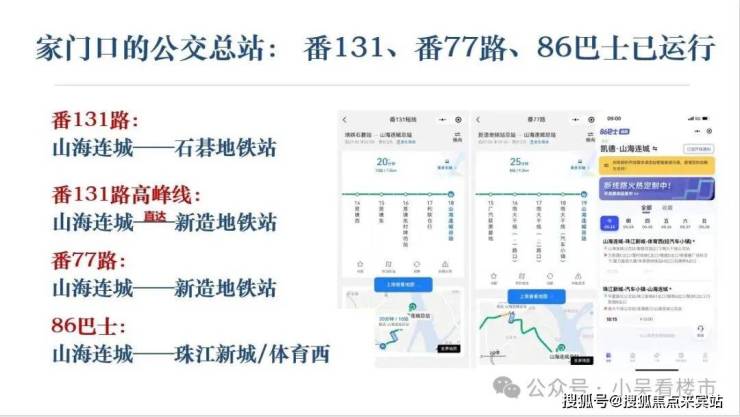 项目公共交通不算好,目前出行基本上靠自驾,最近的地铁4号线都要10公里,后续周边有规划地铁8号线东延线{莲花湾至万胜围}预计2027年底通车,全程8个站,通车后,莲花湾到海珠只要20分钟,不过站点距离项目也不近,目前隔壁山海连城家门口有公交总站,番131、番77、86巴士都已经运行,去新造地铁还算方便。