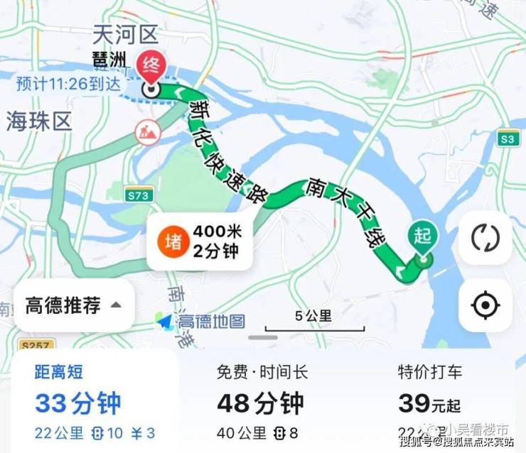 自驾去往琶洲:同上,项目上南大干线转新化快速,最后转新港东路,全程22公里,耗时33分钟,高速费3元。