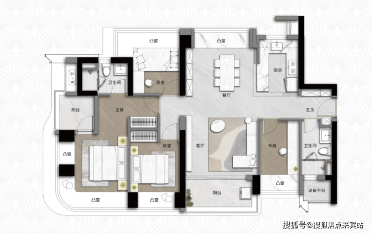 123/126㎡四房两厅两卫:南北通透,约 4.2 米宽厅,LDKB 一体化设计;四开间朝南,六大凸窗 + 设备平台;主卧套房带独立卫浴与 270° 飘窗,适合三代同堂的改善家庭。