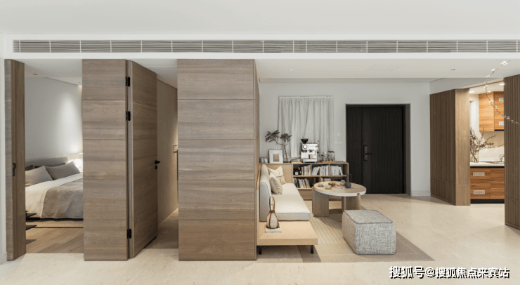 这个户型很罕见地在入户空间,预留了休息会客区域,这里作为舒适的多功能区域与室内室外都能衔接呼应。