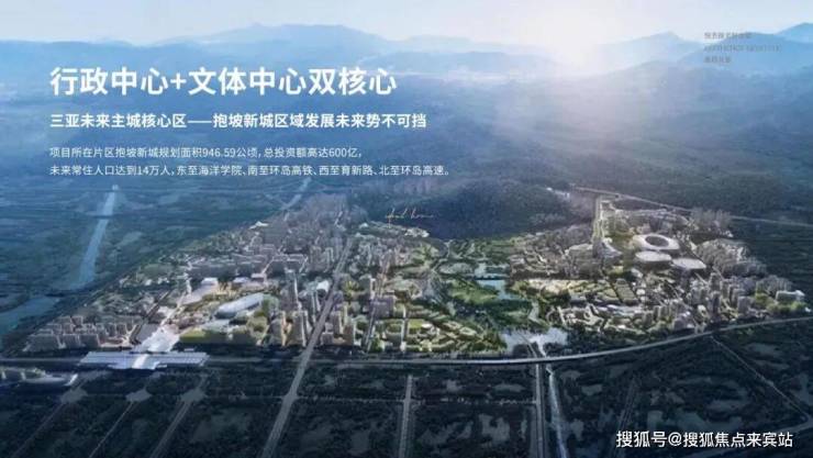项目所属抱坡新城板块,处于“一核”所规划的三亚总部经济区内,规划为融合文化、体育、行政中心的城市综合服务核心区,以文化艺术、运动康乐、购物休闲和深养田居四大组团,打造花园办公、文化体育等创意产业,未来将成为三亚的高水平城市生活服务新城。
