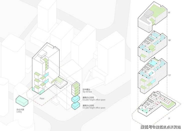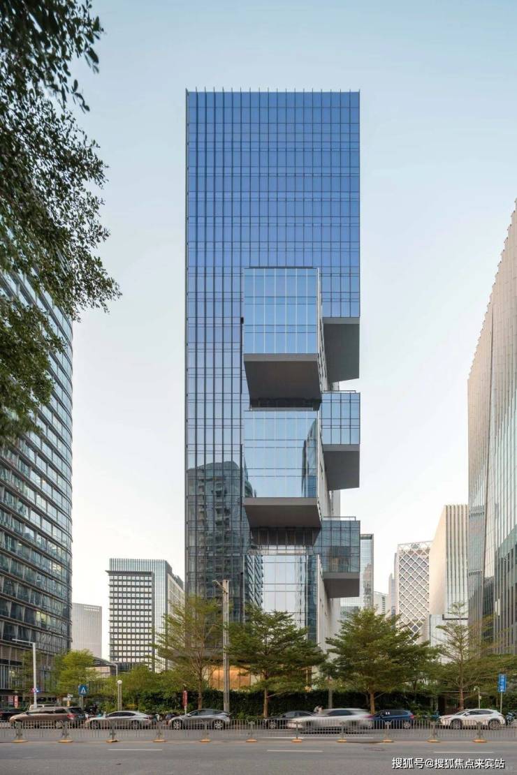 在被摩天大楼紧密环绕的紧凑场地内,大厦只有东南角才能享有深圳湾的景色。为此,设计师策略性地引入一系列互锁的方形体量,并在塔楼中低层区域形成了露台,以带入更多的自然景观,模糊室内外的界限。这样一来,使用者仍能在高楼之中感受广阔的风景,也能与下方的广场活力产生关联。