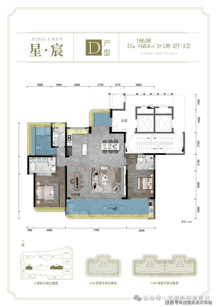 D户型: 建面约166.98-168.4㎡ 3+1房2厅3卫